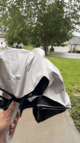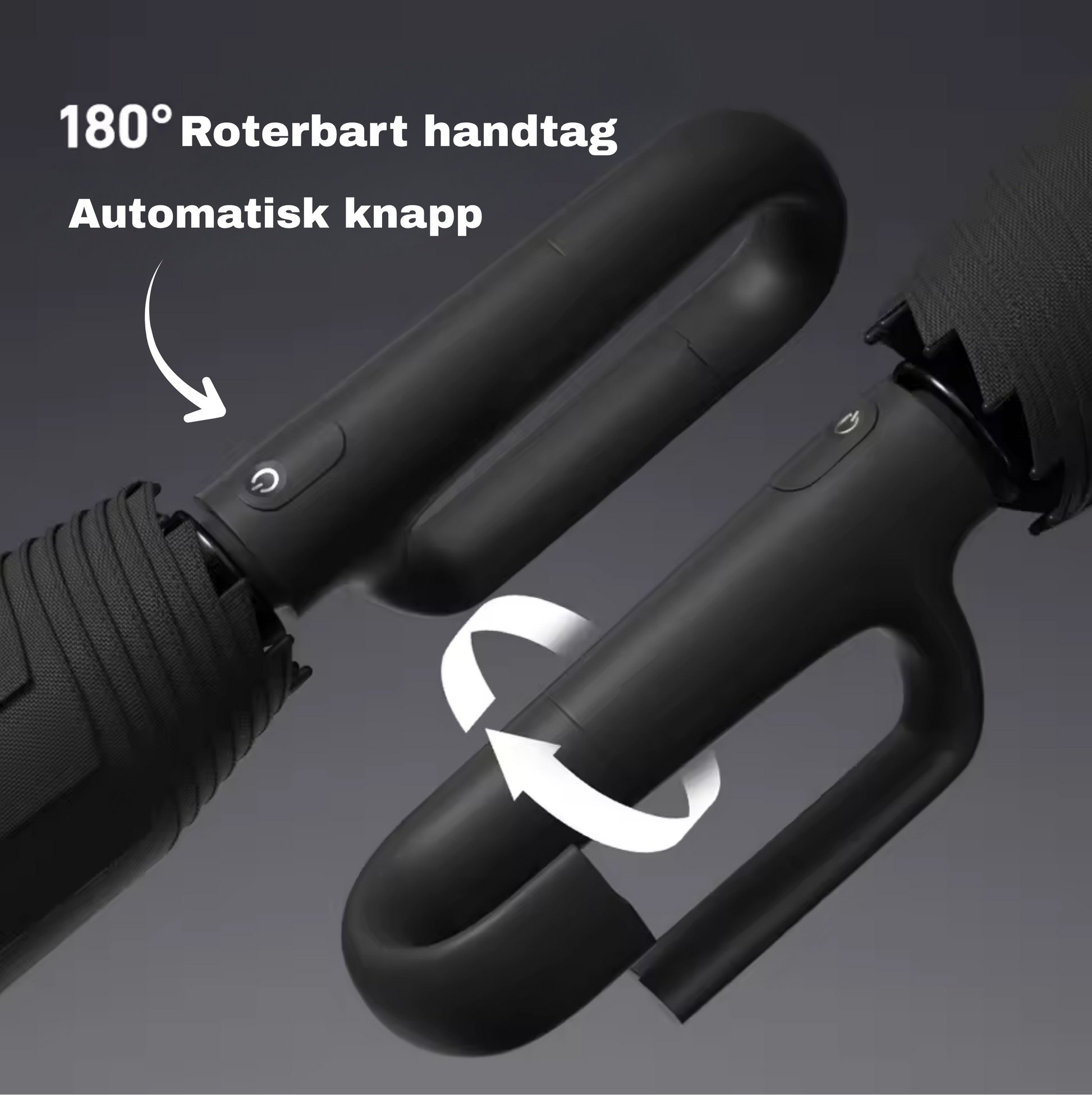 Paraplyet har en smart knapp på handtaget. Tryck en gång för att fälla upp det, och tryck igen för att fälla in det – snabbt, smidigt och perfekt när du har händerna fulla.